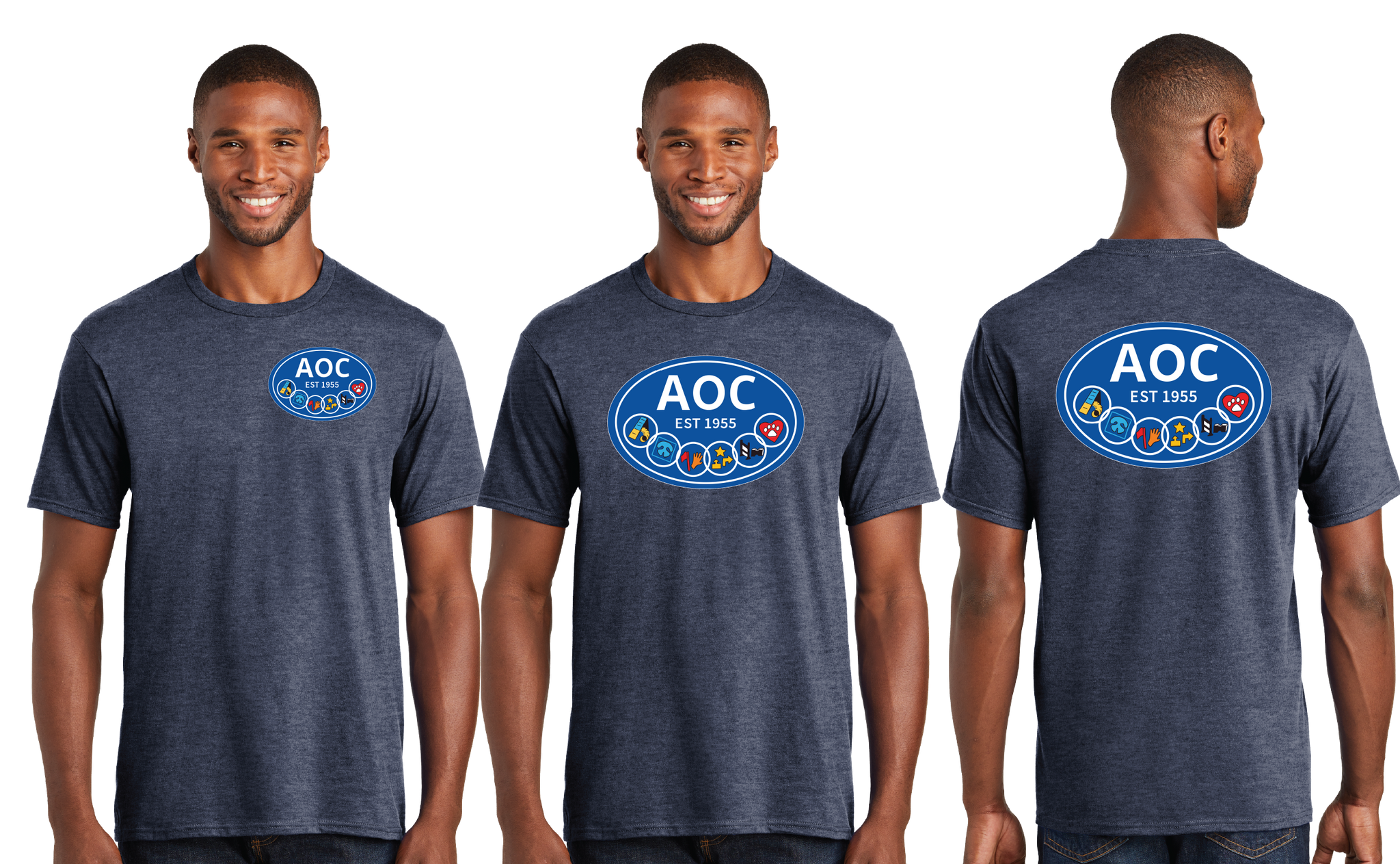 - 50/50 cotton/poly (Dark Heather Grey, Heather Navy)