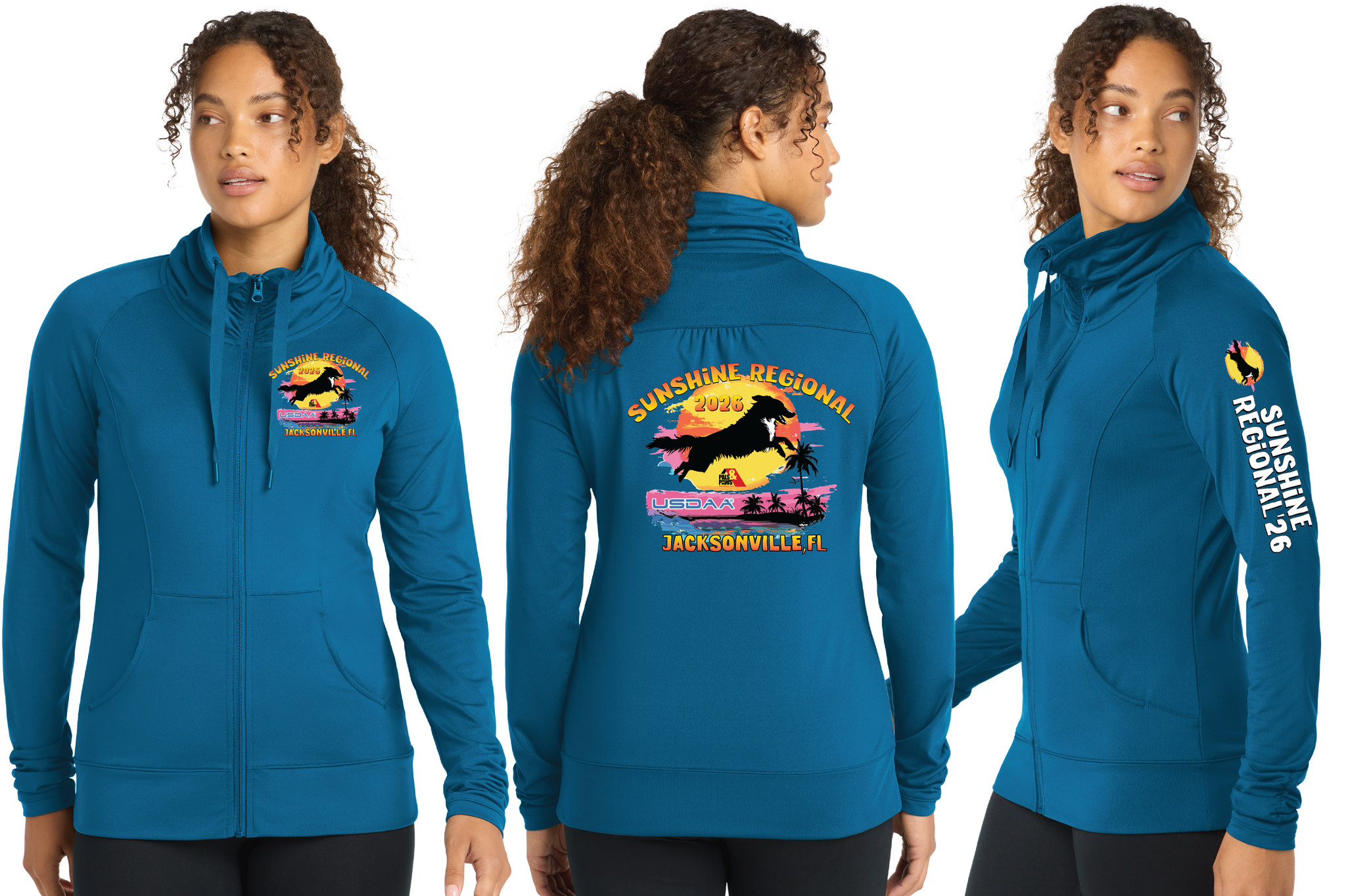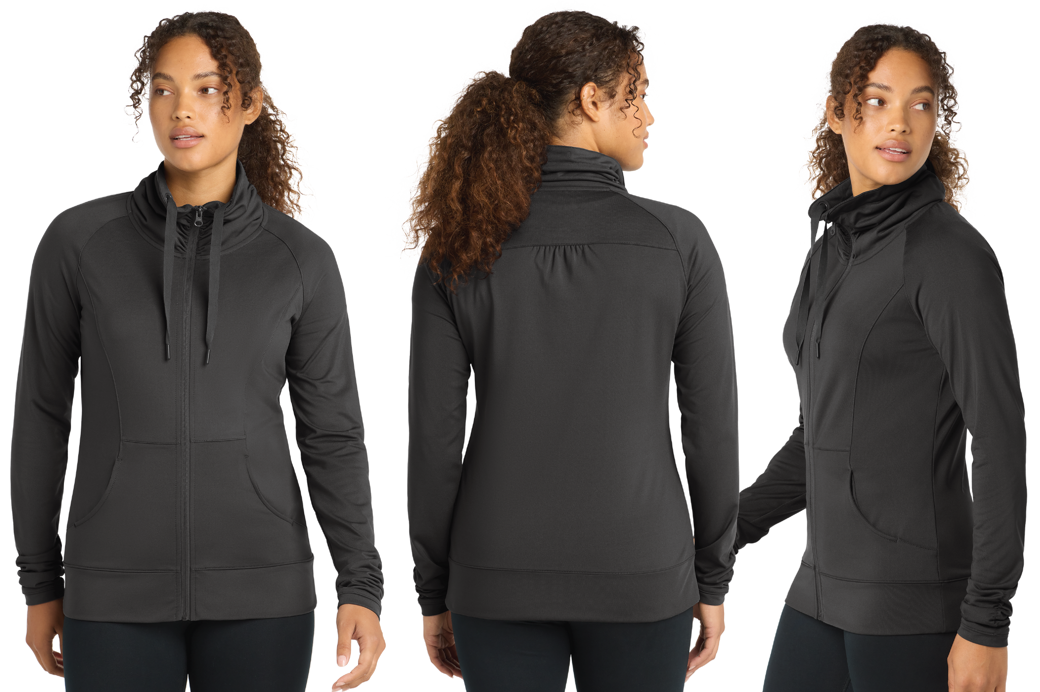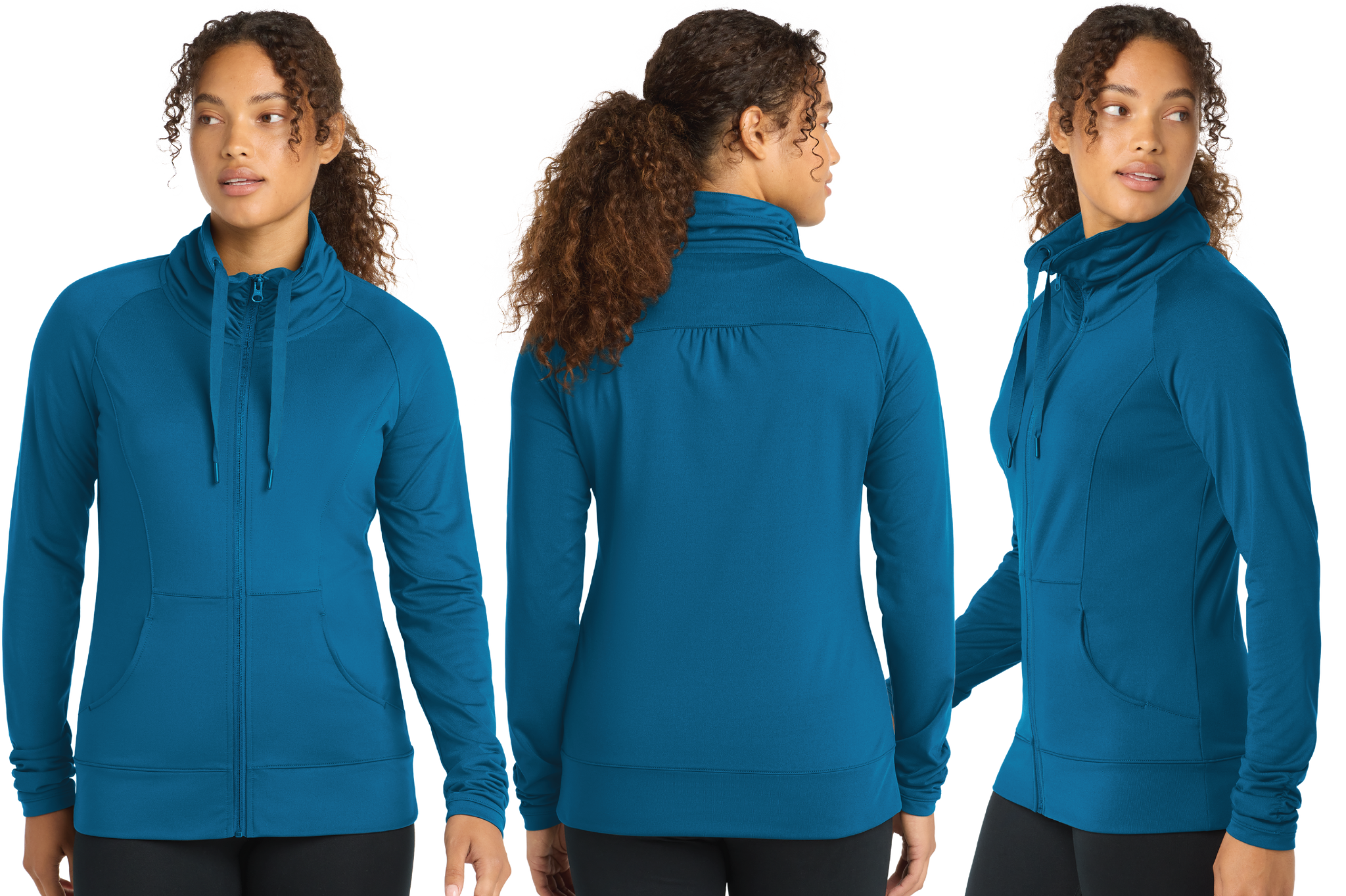 A stretchy, moisture-wicking performance jacket with a soft-brushed backing and unique cowl collar.